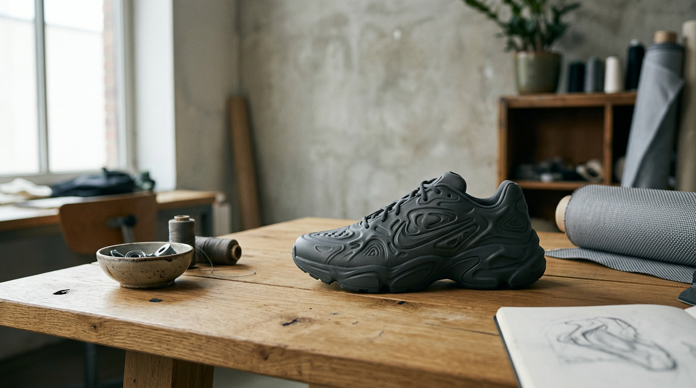 The shoe’s defining feature is its molded, textured upper, which evokes the liquid-metal look of the classic Flightposite. Raised, organic geometries cover the surface, creating a tactile landscape that feels both nostalgic and speculative. By opting for a monochromatic finish, Nike grounds these complex details, allowing the tension of the form to provide the visual interest without the distraction of a varied color palette.